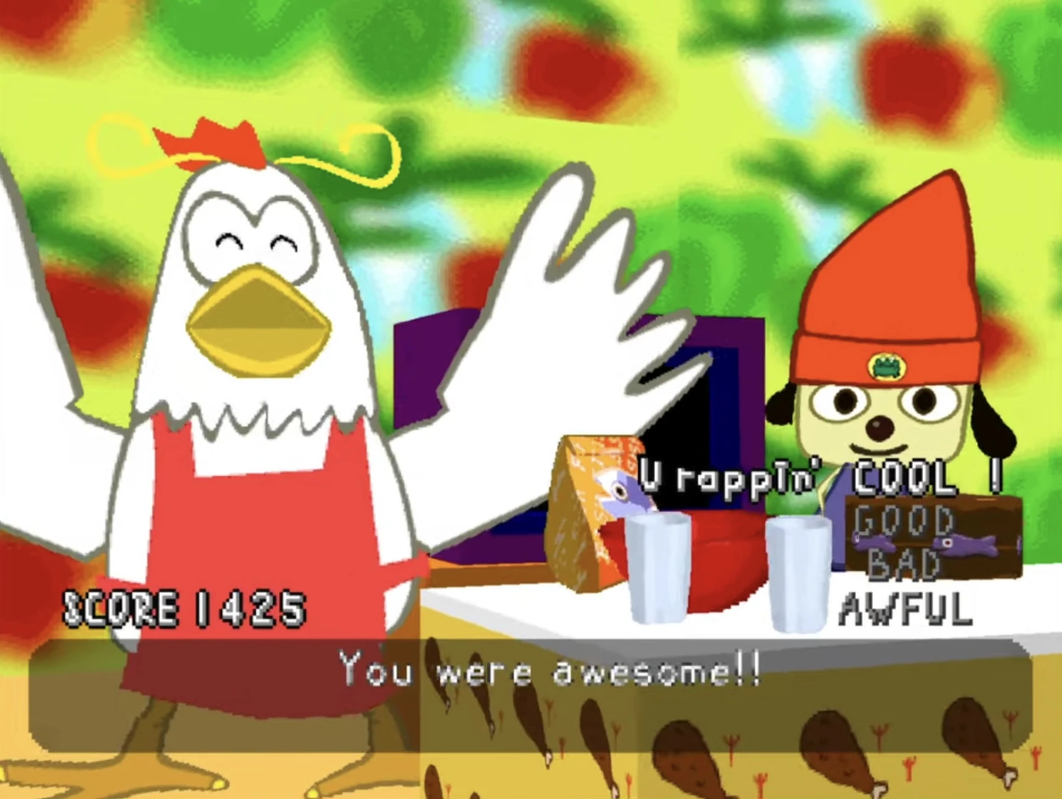 When failing the level, she clucks and lays an egg that a chick hatches from, who is as enraged as their mother, and scolds Parappa in her place.