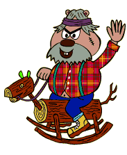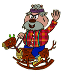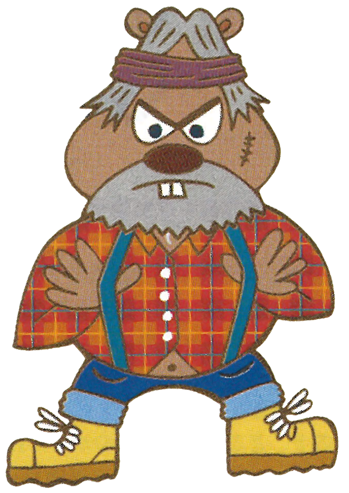 He is a rather rotund brown beaver with small buck teeth, wearing a red plaid shirt with white buttons. interestingly, he is always seen with his bottom button undone, revealing his belly button (or maybe the shirt just doesn't fit). He also wears denim overalls rolled up at the legs, with green straps, and yellow boots. He sports a beard and grey hair with a headband. He also has a scar with stitch marks on his left cheek, most likely from a woodworking accident.